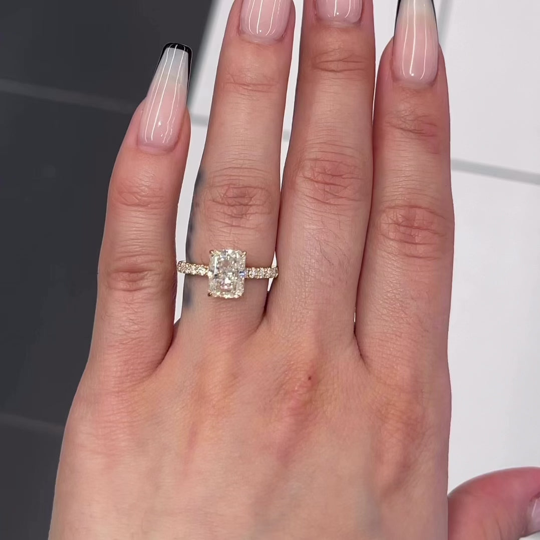 Excellent cut, polish and symmetry and is set in a classy side stones hidden halo setting in real, solid 14K gold. Classic claw prongs and a delicate basket setting securely cradle the center, allowing it to shine with maximum brilliance. This gorgeous ring showcases a breathtaking 2 carat radiant-cut diamond and features a hidden diamond halo. The band is masterfully set 3/4 of the way around with beautiful pavé lab-grown diamonds, completing the simple and elegant, yet eye-catching engagement ring! You may customize this item by choosing either 14K yellow gold, 14K white gold or 14K rose gold.
