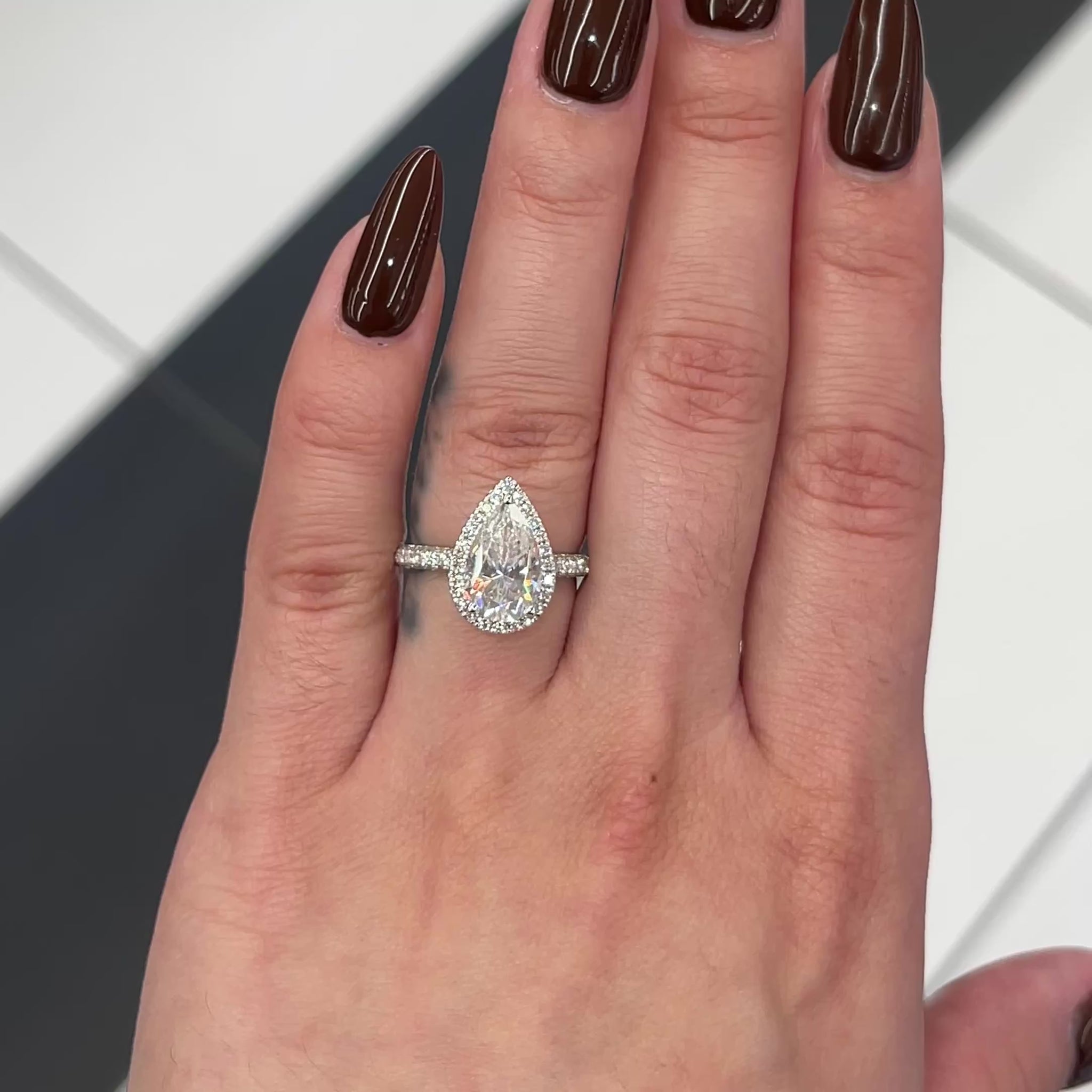 Excellent cut, polish and symmetry and is set in a classy side stones visible halo setting in real, solid 14K gold. Classic claw prongs and a delicate basket setting securely cradle the center, allowing it to shine with maximum brilliance. This gorgeous ring showcases a breathtaking 2 carat pear-cut diamond center and features a visible diamond halo. The band is masterfully set 3/4 of the way around with beautiful pavé lab-grown diamonds on all three sides, completing the luxurious yet elegant engagement ring! You may customize this item by choosing either 14K yellow gold, 14K white gold or 14K rose gold.
