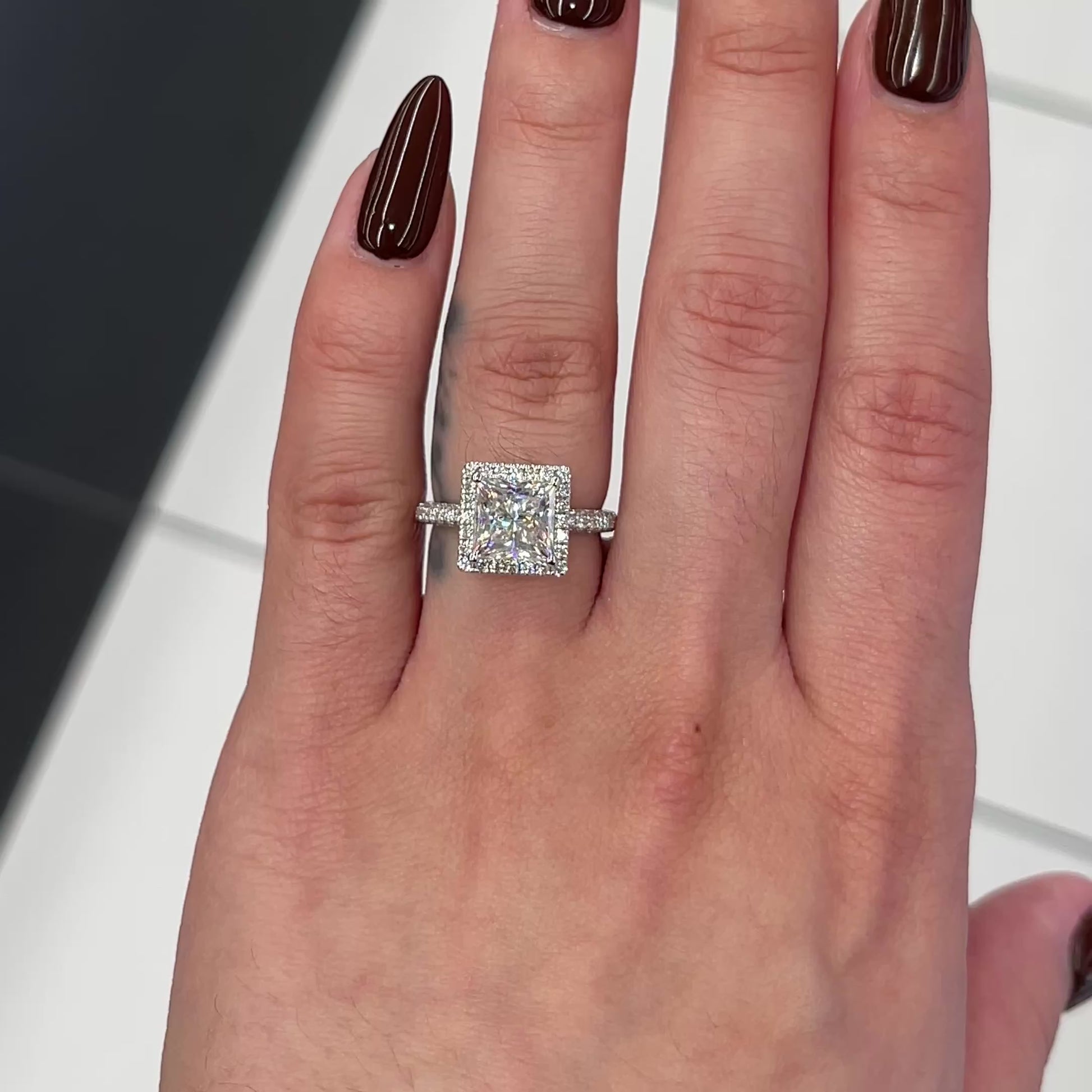 Excellent cut, polish and symmetry and is set in a classy side stones visible halo setting in real, solid 14K gold. Classic claw prongs and a delicate basket setting securely cradle the center, allowing it to shine with maximum brilliance. This gorgeous ring showcases a breathtaking 2 carat princess-cut lab diamond center and features a visible diamond halo. The band is masterfully set 3/4 of the way around with beautiful pavé lab-grown diamonds on all three sides, completing the luxurious yet elegant engagement ring! You may customize this item by choosing either 14K yellow gold, 14K white gold or 14K rose gold.