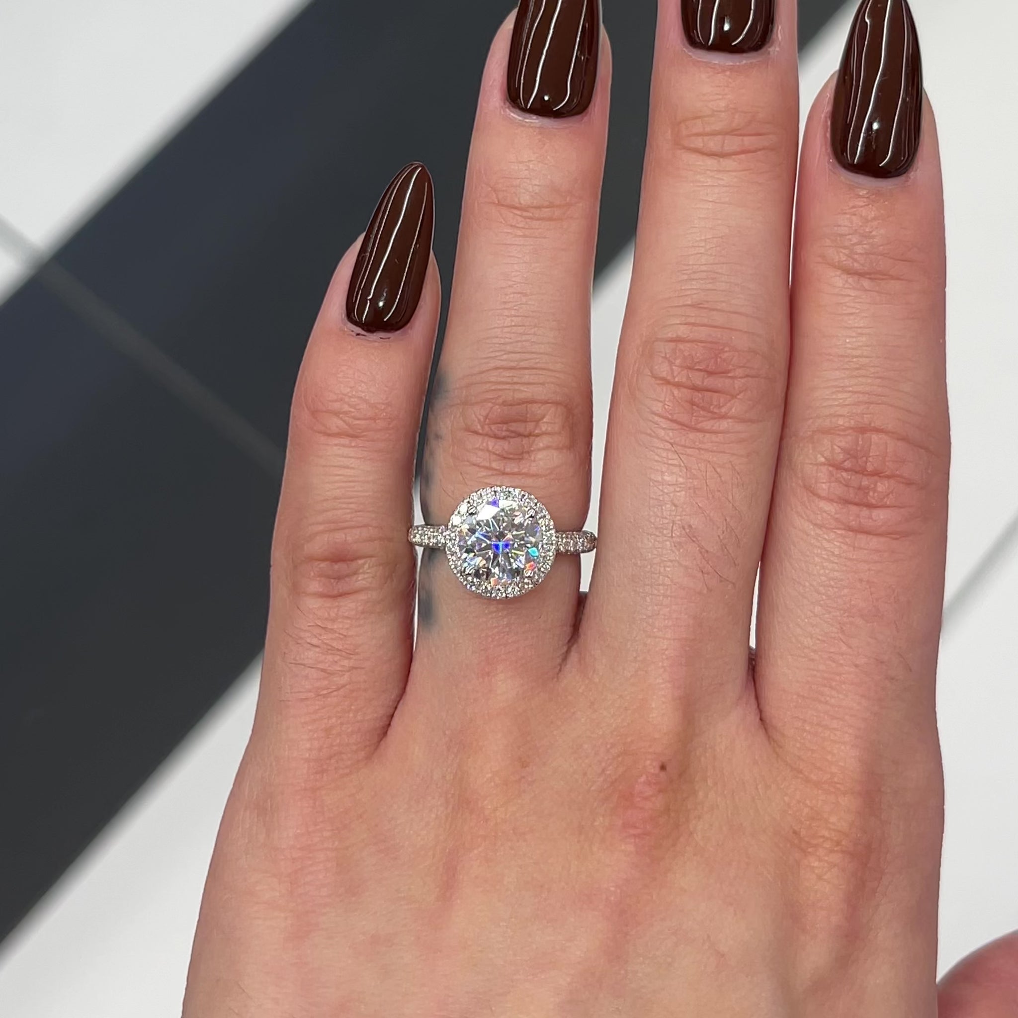 Excellent cut, polish and symmetry and is set in a classy side stones visible halo setting in real, solid 14K gold. Classic claw prongs and a delicate basket setting securely cradle the center, allowing it to shine with maximum brilliance. This gorgeous ring showcases a breathtaking 2 carat round-cut lab diamond center and features a visible diamond halo. The band is masterfully set 3/4 of the way around with beautiful pavé lab-grown diamonds on all three sides, completing the luxurious yet elegant engagement ring! You may customize this item by choosing either 14K yellow gold, 14K white gold or 14K rose gold.