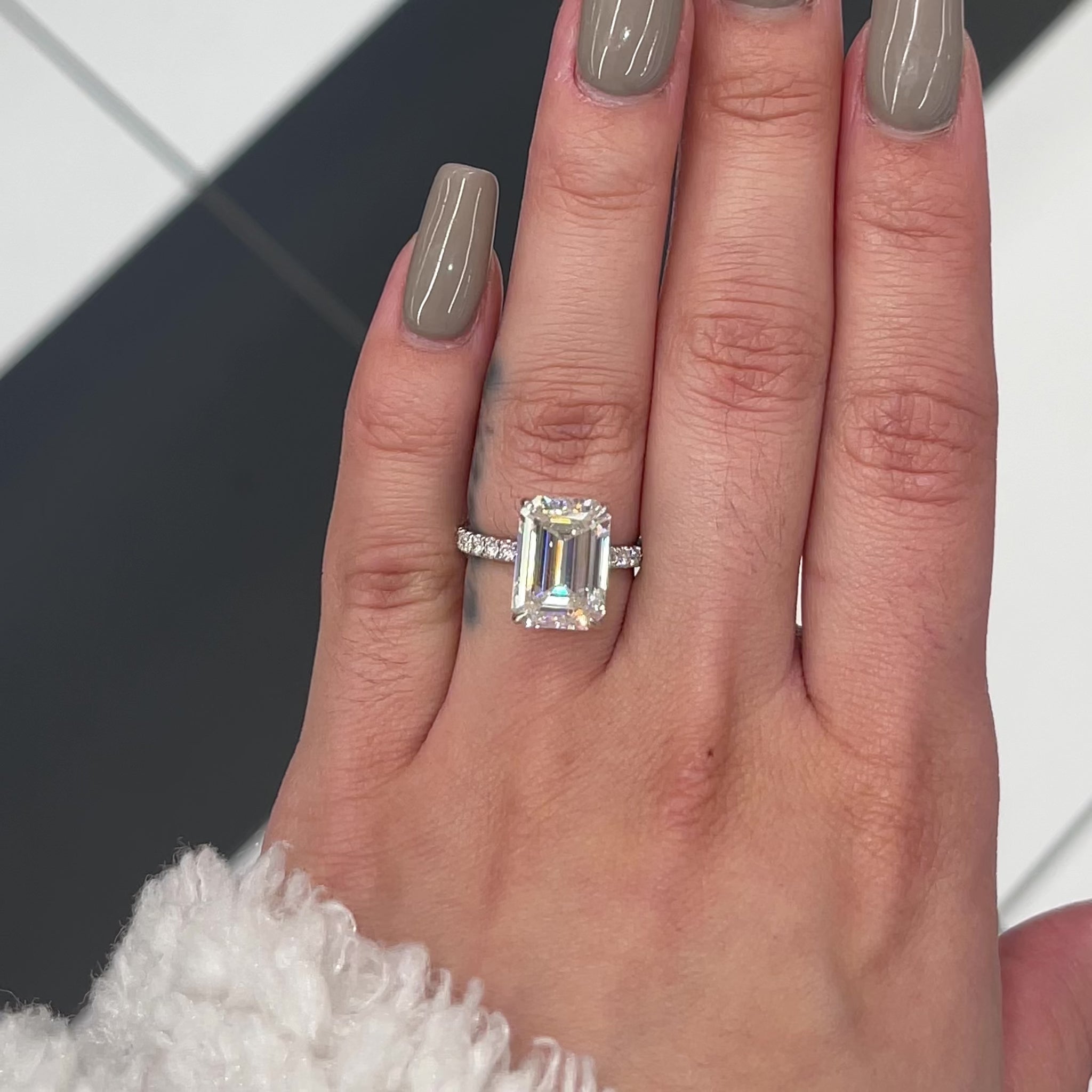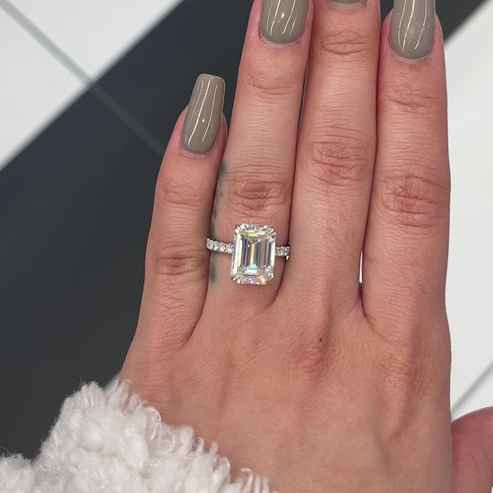 Excellent cut, polish and symmetry and is set in a classy side stones hidden halo setting in real, solid 14K gold. Classic claw prongs and a delicate basket setting securely cradle the center, allowing it to shine with maximum brilliance. This gorgeous ring showcases a breathtaking 5 carat emerald-cut diamond and features a hidden diamond halo. The band is masterfully set 3/4 of the way around with beautiful pavé lab-grown diamonds, completing the simple and elegant, yet eye-catching engagement ring! You may customize this item by choosing either 14K yellow gold, 14K white gold or 14K rose gold.