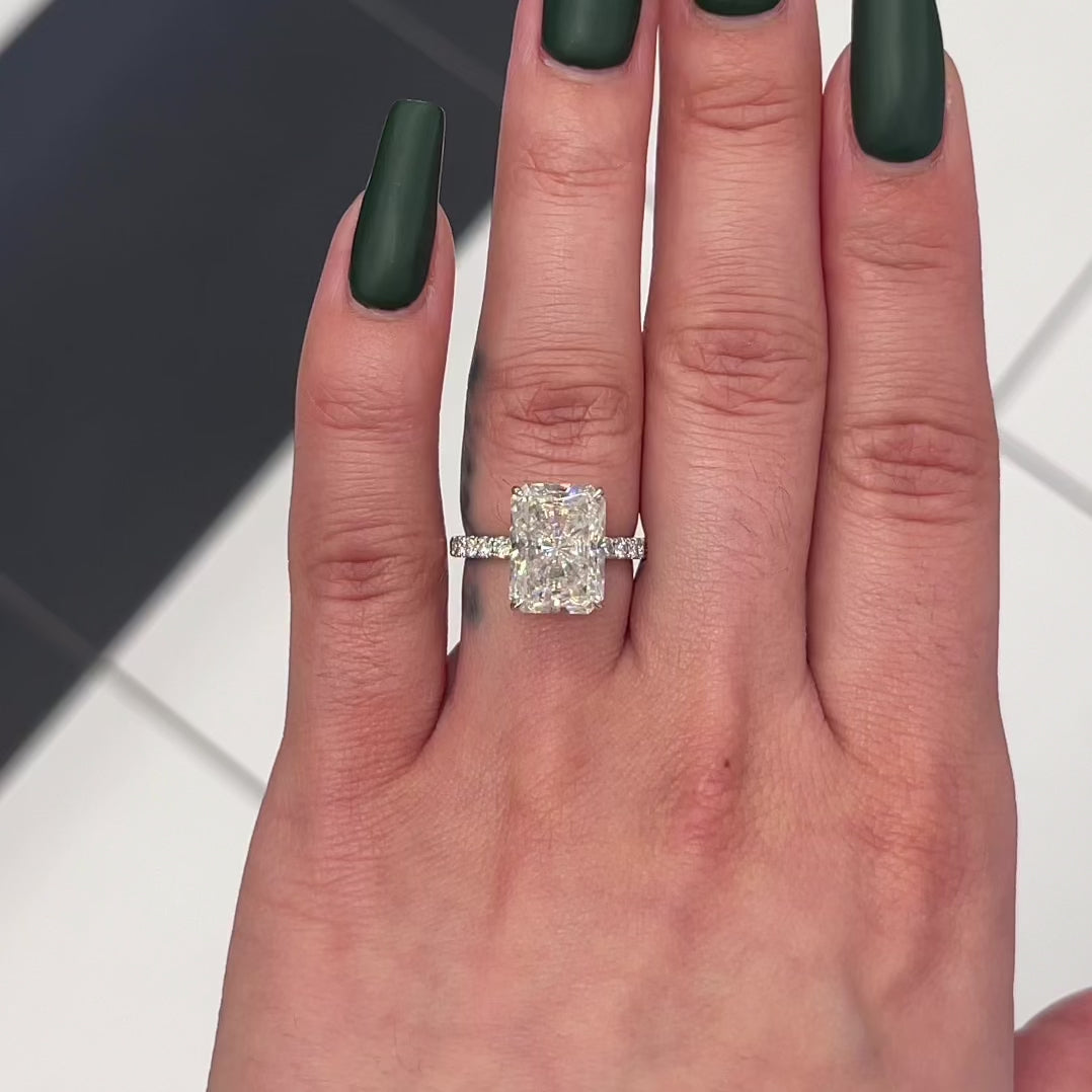 Excellent cut, polish and symmetry and is set in a classy side stones hidden halo setting in real, solid 14K gold. Classic claw prongs and a delicate basket setting securely cradle the center, allowing it to shine with maximum brilliance. This gorgeous ring showcases a breathtaking 5 carat radiant-cut diamond and features a hidden diamond halo. The band is masterfully set 3/4 of the way around with beautiful pavé lab-grown diamonds, completing the simple and elegant, yet eye-catching engagement ring! You may customize this item by choosing either 14K yellow gold, 14K white gold or 14K rose gold.