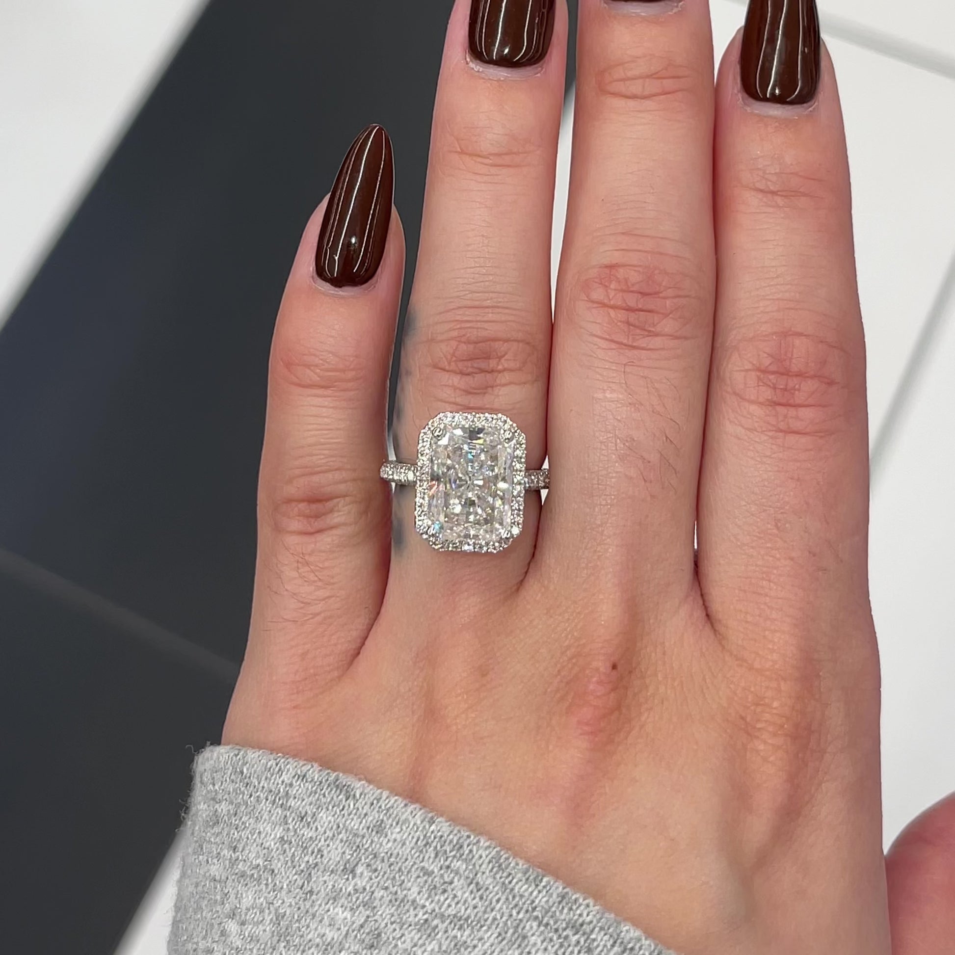 Excellent cut, polish and symmetry and is set in a classy side stones visible halo setting in real, solid 14K gold. Classic claw prongs and a delicate basket setting securely cradle the center, allowing it to shine with maximum brilliance. This gorgeous ring showcases a breathtaking 5 carat radiant-cut diamond center and features a visible diamond halo. The band is masterfully set 3/4 of the way around with beautiful pavé lab-grown diamonds on all three sides, completing the luxurious yet elegant engagement ring! You may customize this item by choosing either 14K yellow gold, 14K white gold or 14K rose gold.