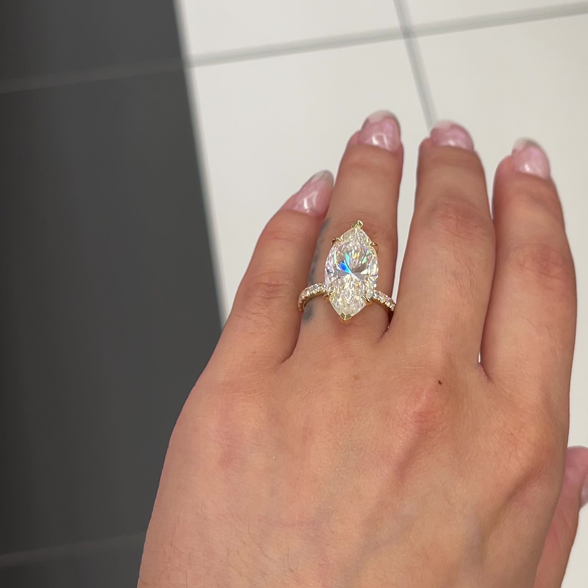 Excellent cut, polish and symmetry and is set in a classy side stones hidden halo setting in real, solid 14K gold. Classic claw prongs and a delicate basket setting securely cradle the center, allowing it to shine with maximum brilliance. This gorgeous ring showcases a breathtaking 7 carat marquise-cut diamond and features a hidden diamond halo. The band is masterfully set 3/4 of the way around with beautiful pavé lab-grown diamonds, completing the simple and elegant, yet eye-catching engagement ring! You may customize this item by choosing either 14K yellow gold, 14K white gold or 14K rose gold.