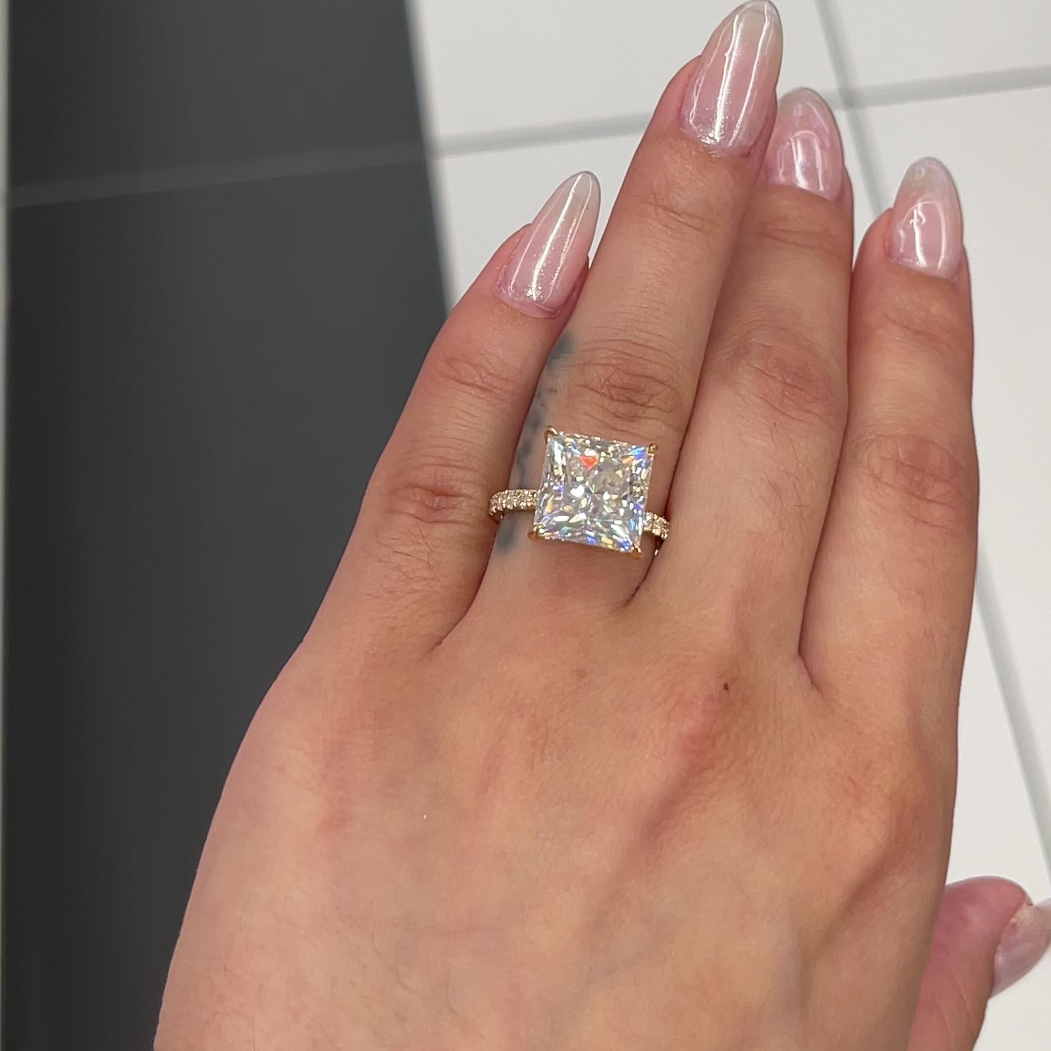 Excellent cut, polish and symmetry and is set in a classy side stones hidden halo setting in real, solid 14K gold. Classic claw prongs and a delicate basket setting securely cradle the center, allowing it to shine with maximum brilliance. This gorgeous ring showcases a breathtaking 7 carat princess-cut diamond and features a hidden diamond halo. The band is masterfully set 3/4 of the way around with beautiful pavé lab-grown diamonds, completing the simple and elegant, yet eye-catching engagement ring! You may customize this item by choosing either 14K yellow gold, 14K white gold or 14K rose gold.
